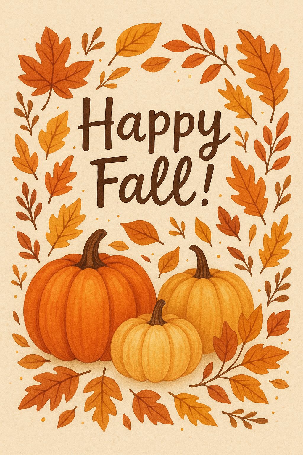 “Whimsical autumn greeting card with pumpkins and leaves. Text says ‘Happy Fall!’ in playful handwritten font. Warm colors, cozy vibe, plain background.”
