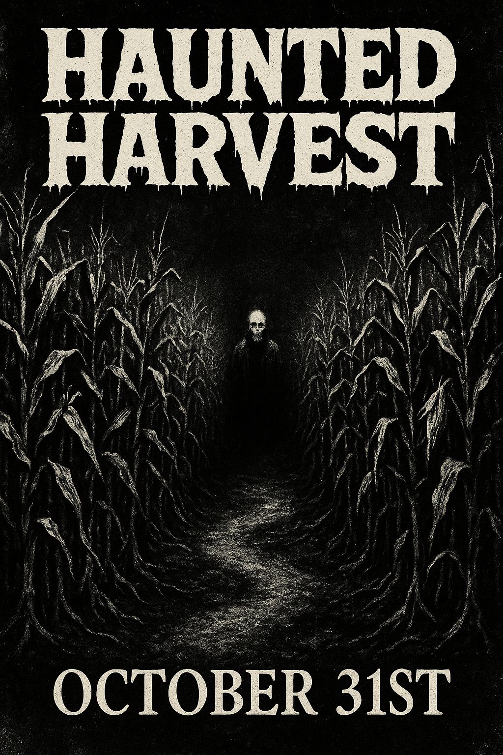 “A haunted corn maze poster. Title reads ‘Haunted Harvest’ in spooky dripping font at the top. Subtitle reads ‘October 31st’ in serif font at the bottom. High contrast, centered layout, cinematic horror design.”