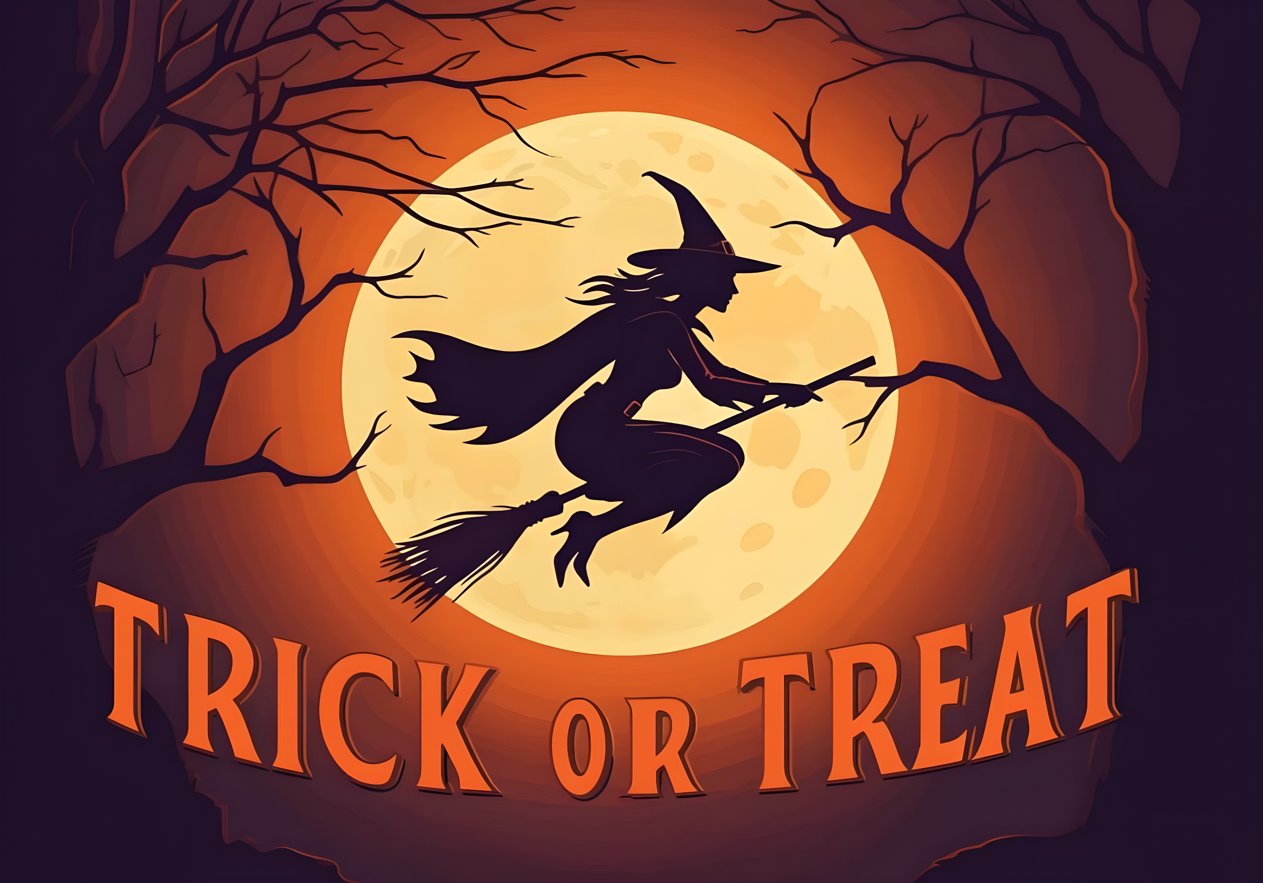 “Vintage Halloween postcard. Witch flying over a harvest moon. Text says ‘Trick or Treat’ in bold retro typeface, bottom left corner. Orange and purple palette.”